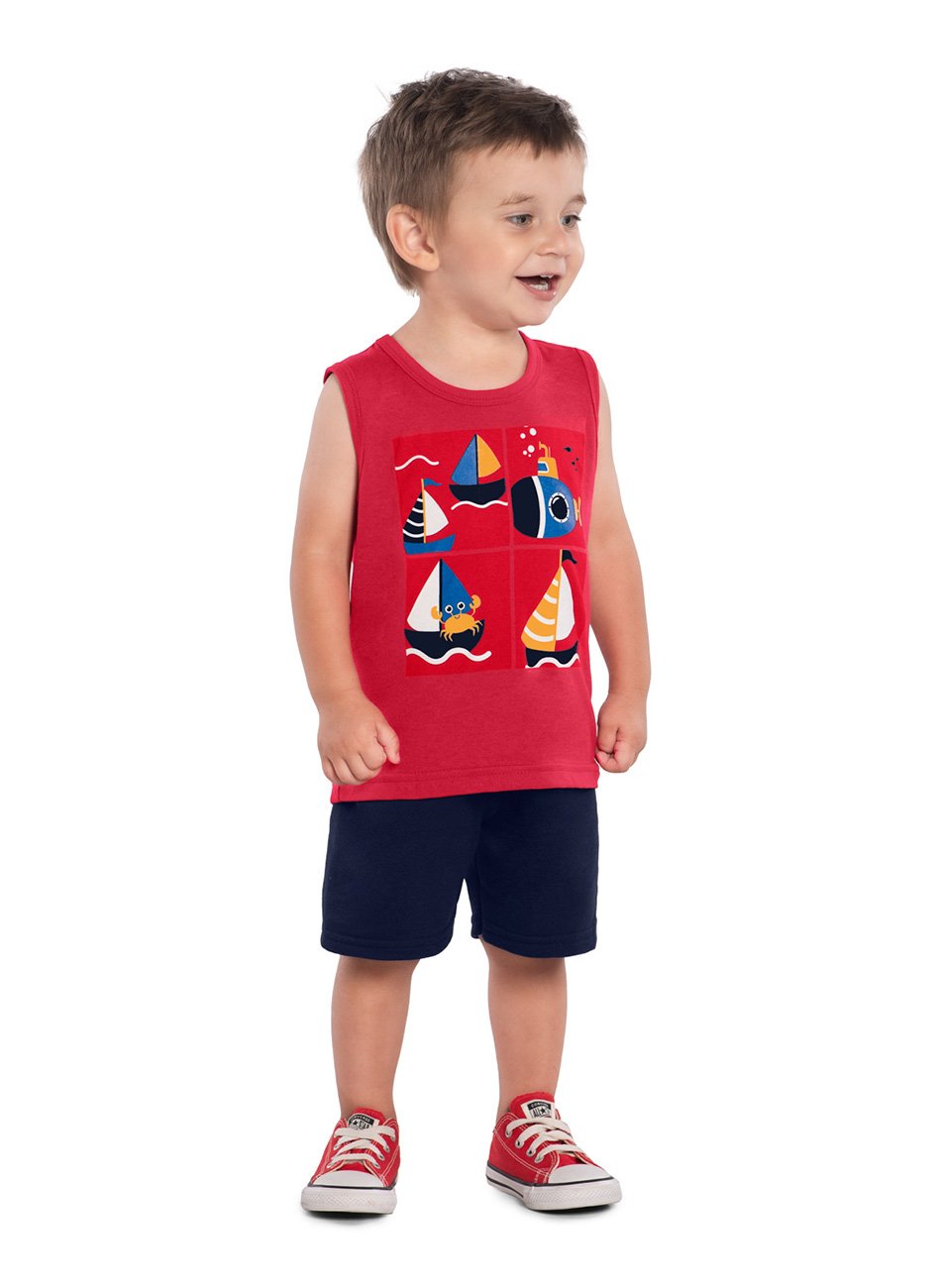 A regata é feita em meia malha, um tecido leve e respirável que proporciona um toque suave na pele. O destaque da regata é a estampa divertida de barquinhos, que traz um charme especial e um toque lúdico ao visual infantil.