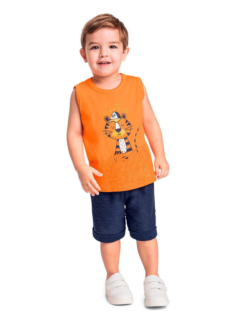 Complementando a regata, a bermuda é feita em moletinho macio e confortável, ideal para atividades ao ar livre. O design prático e casual da bermuda a torna perfeita para brincar, correr e se divertir. Além disso, o tecido é leve e respirável, garantindo que a criança se mantenha fresca mesmo em climas mais quentes.