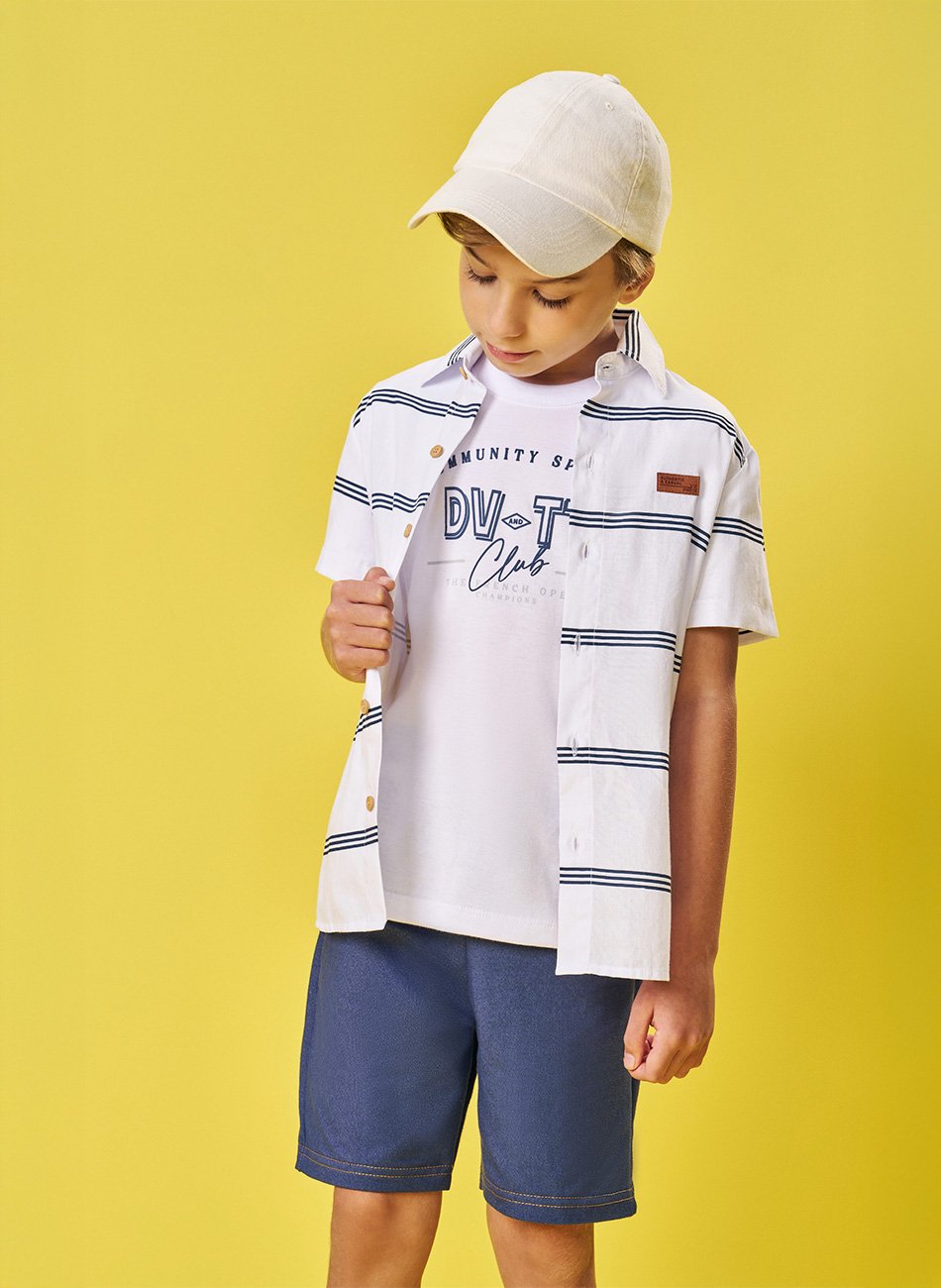 Conjunto Trio Infantil Masculino da marca Divertto é a escolha perfeita para pais que buscam estilo, conforto e praticidade em uma única compra. Composto por camiseta em meia malha, camisa em tricoline listrado e bermuda com cadarço de amarração, esse conjunto oferece múltiplas possibilidades de uso para diferentes ocasiões, do casual ao mais arrumadinho.