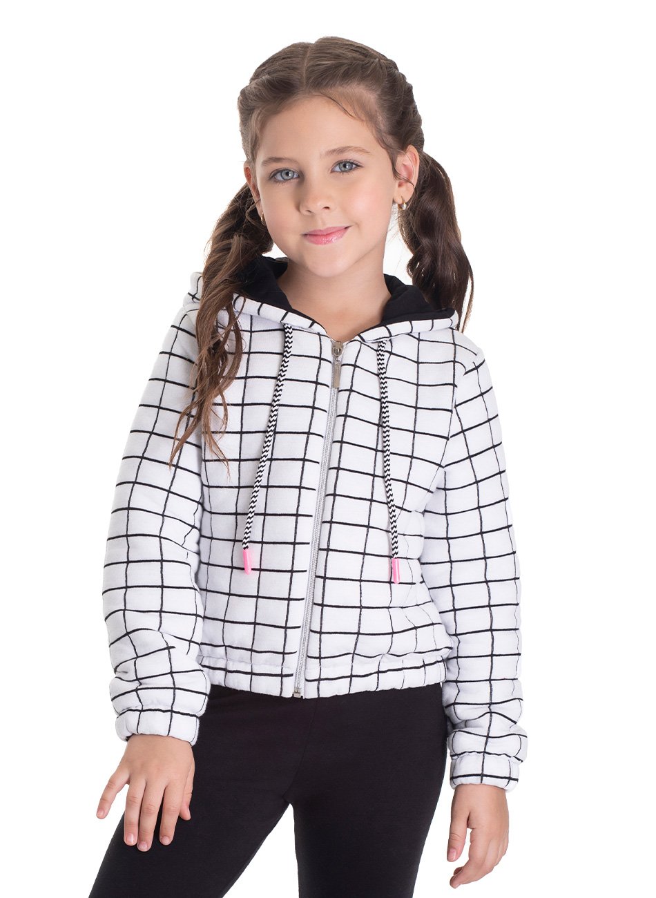 Jaqueta com capuz em Matelassê Xadrez Grade 72% Poliéster / 28% Algodão, cadarço trançado roliço e ziper metalizado, punho com elástico.