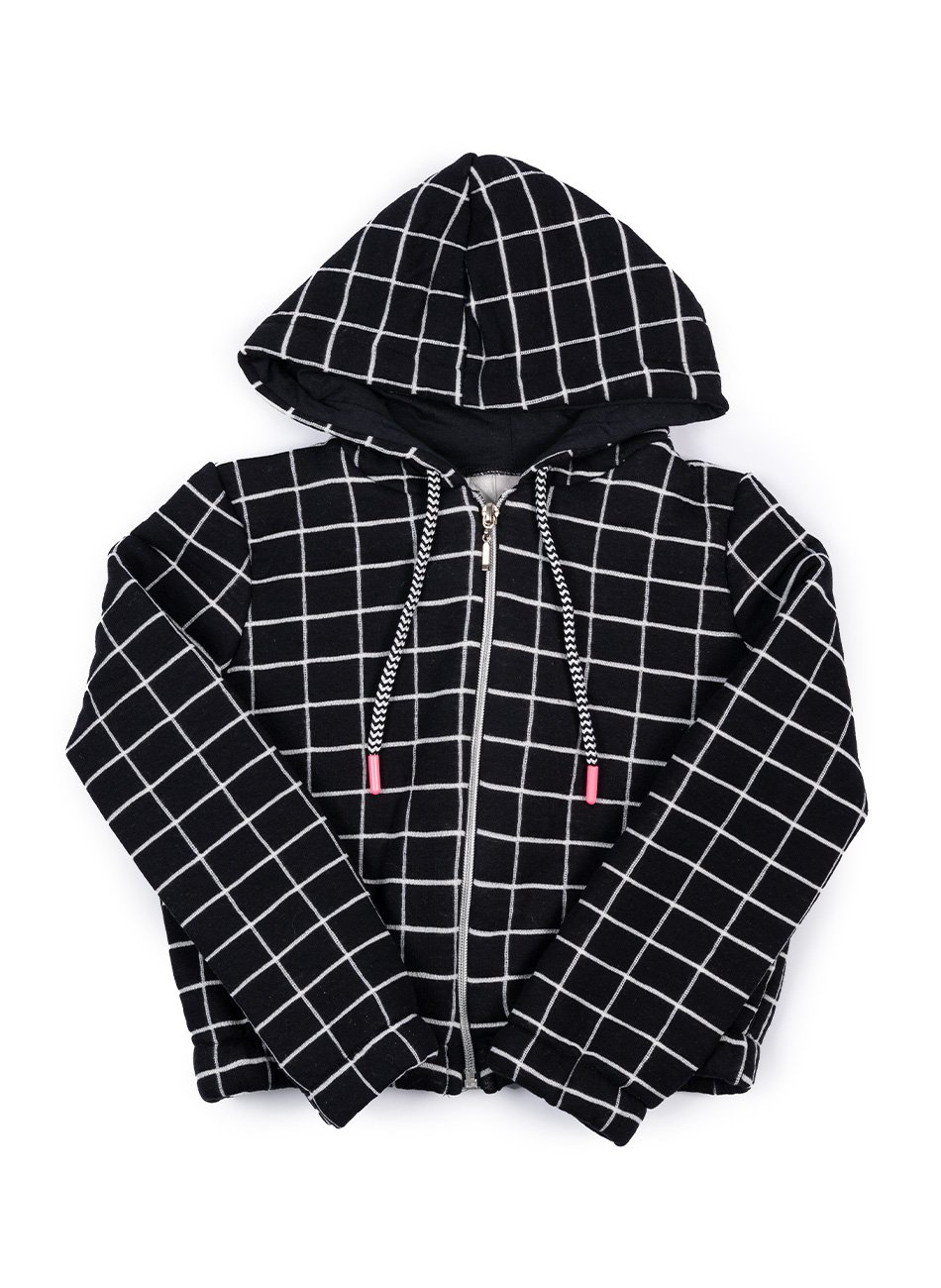 Jaqueta com capuz em Matelassê Xadrez Grade 72% Poliéster / 28% Algodão, cadarço trançado roliço e ziper metalizado, punho com elástico.