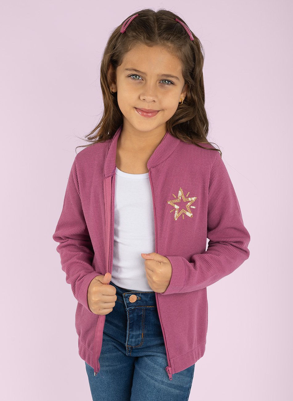 Jaqueta em moletom trabalhado, sem felpa. Possui textura de "bolinhas" em sua parte externa. Detalhe de estrelinha em lantejoulas douradas na parte frontal da peça. Não possui capuz.