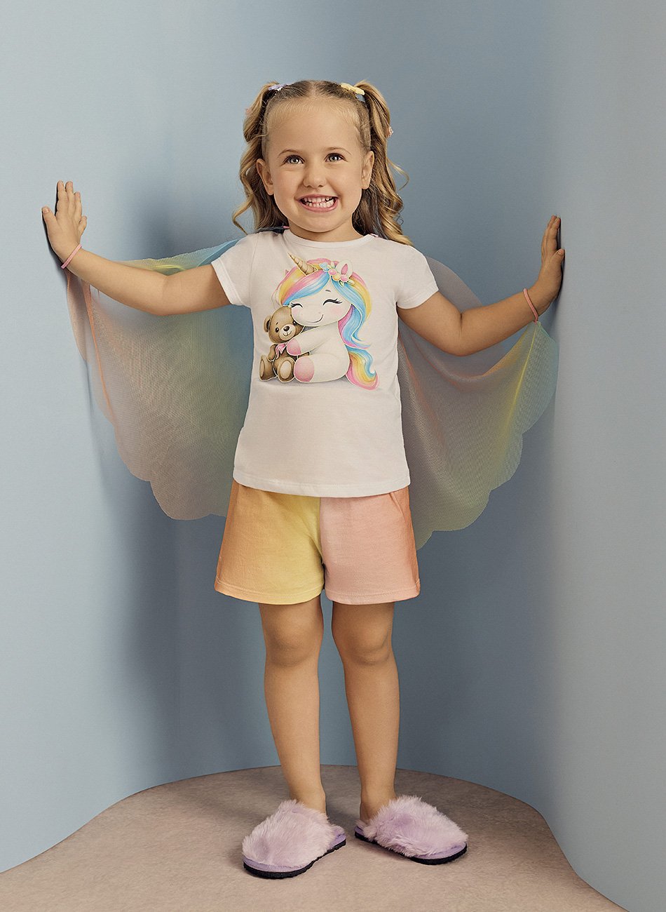 O shorts com estampa rotativa complementa o pijama, garantindo um visual alegre e moderno.