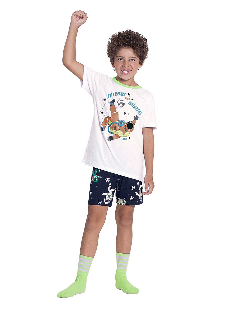 Pijama Meia Malha Penteada Infantil Menino - Alakazoo é perfeito para noites de conforto e diversão. Desenvolvido com meia malha penteada, um tecido macio e respirável, esse pijama proporciona conforto durante toda a noite, garantindo que a criança tenha um sono tranquilo. A camisa conta com uma estampa frontal divertida que, além de estilosa, brilha no escuro, trazendo um toque especial e mágico à rotina noturna dos pequenos. A diversão não para por aí! A bermuda com estampa rotativa oferece um visual alegre e moderno, com gráficos que encantam e deixam o conjunto ainda mais único.
