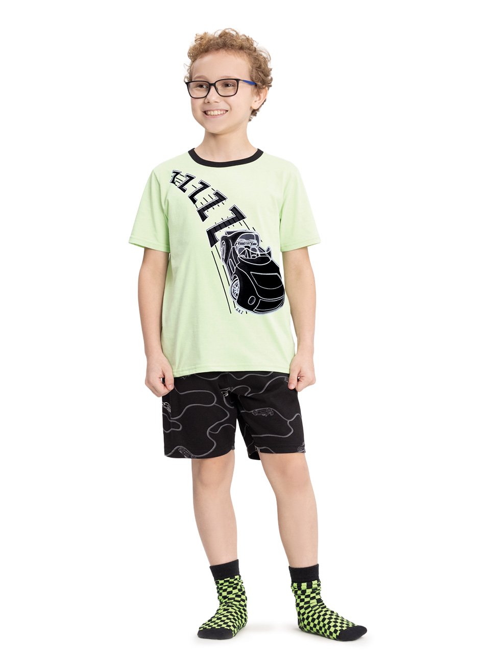 A blusa possui uma estampa frontal moderna, enquanto a bermuda traz uma estampa rotativa exclusiva, adicionando personalidade e diversão ao visual noturno. O grande destaque fica por conta dos detalhes que brilham no escuro, tornando a peça ainda mais incrível e interativa para os pequenos.