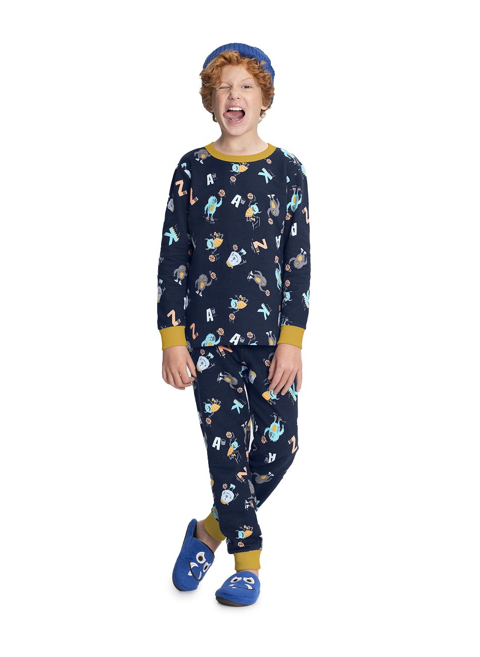 Pijama em moletom felpado composto por blusa e calça. Estampa rotativa e ribana na barra e gola.