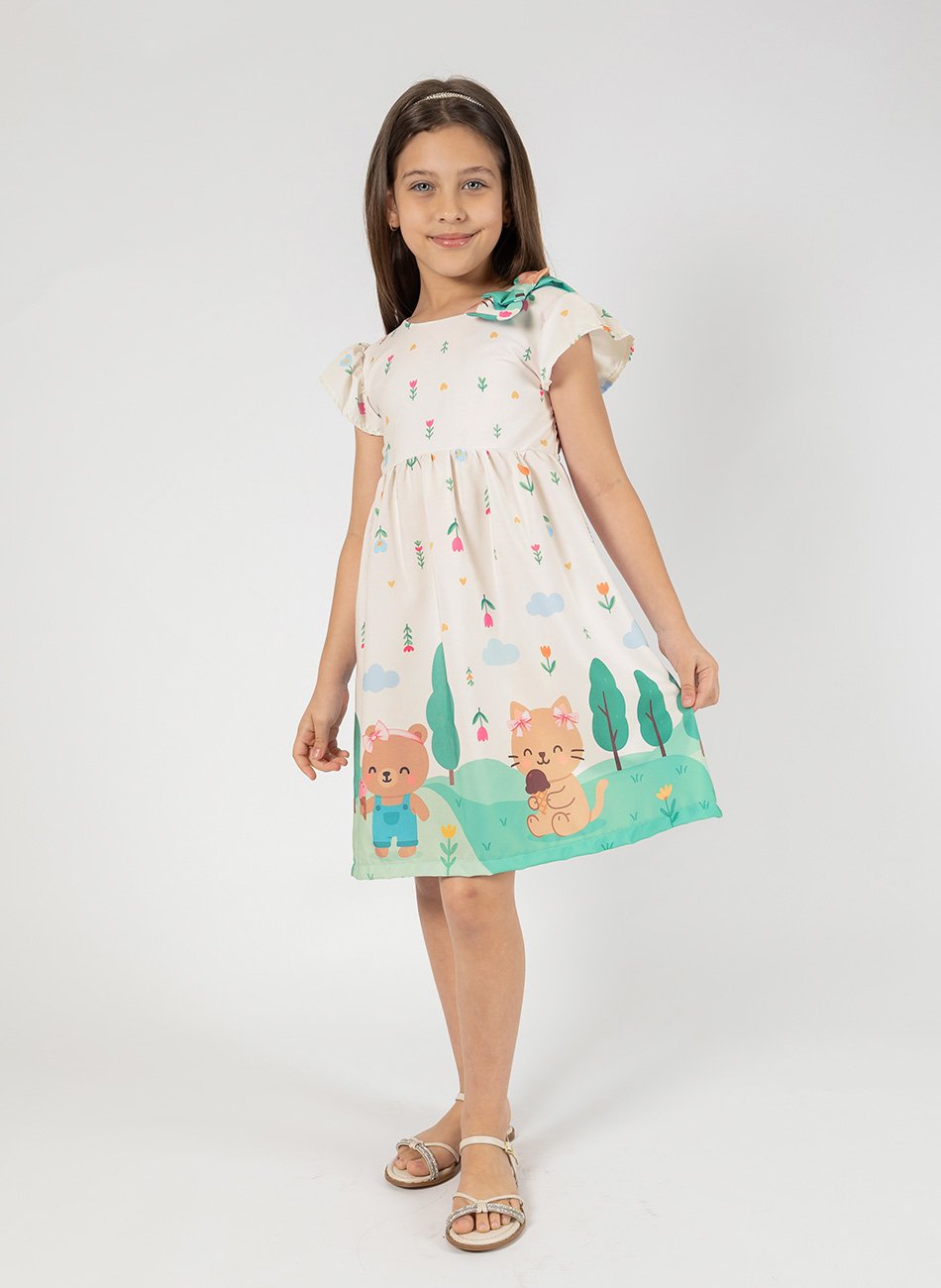 O modelo tem manguinhas com babadinhos, cintura marcada e saia soltinha, proporcionando movimento e um caimento perfeito para o dia a dia, passeios e momentos especiais.