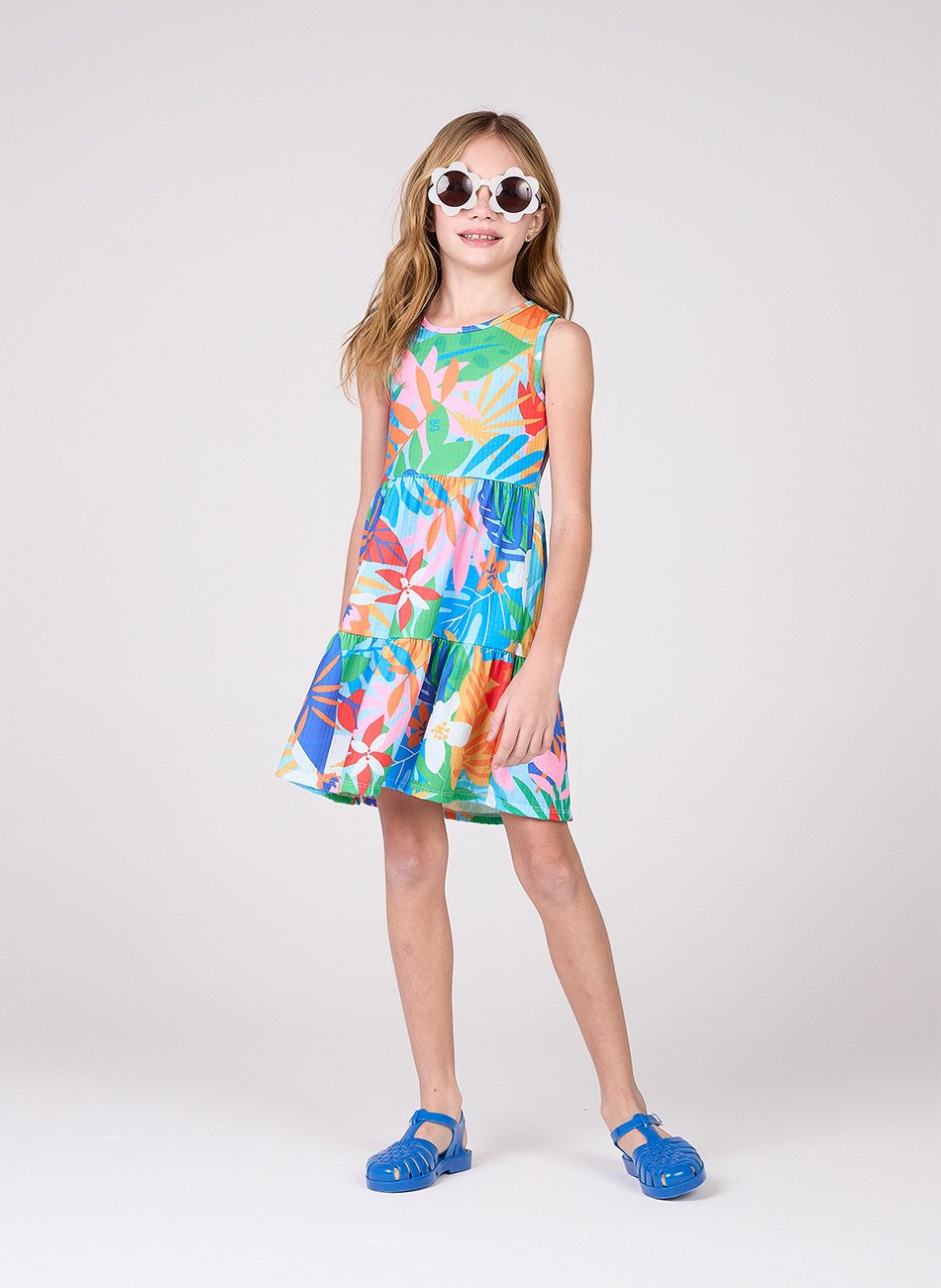 A estampa de cores vivas e alegres deste vestido é perfeita para as meninas que adoram se destacar. O design inclui um recorte franzido que assegura um caimento impecável, valorizando o visual e proporcionando um toque de sofisticação. Além disso, o tecido é fácil de cuidar, pois não amassa com facilidade, tornando-o uma peça prática e funcional para o dia a dia.