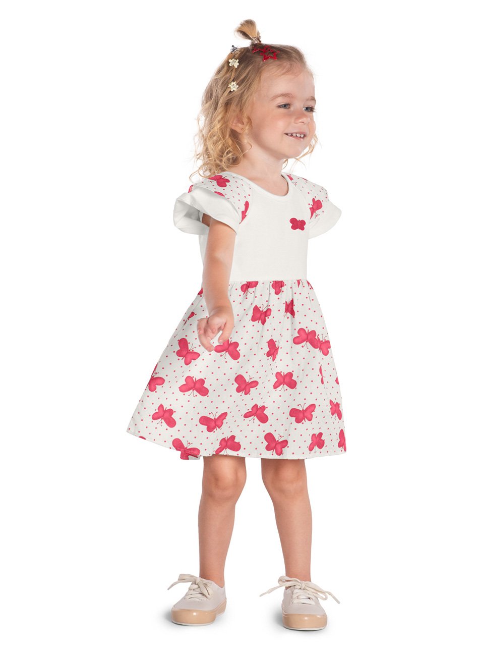 O vestido apresenta um lindo bordado com entreteia, que adiciona um toque de sofisticação e delicadeza à peça. Este detalhe refinado é complementado pela estampa rotativa, que traz um visual moderno e divertido, perfeito para meninas que adoram estar na moda.