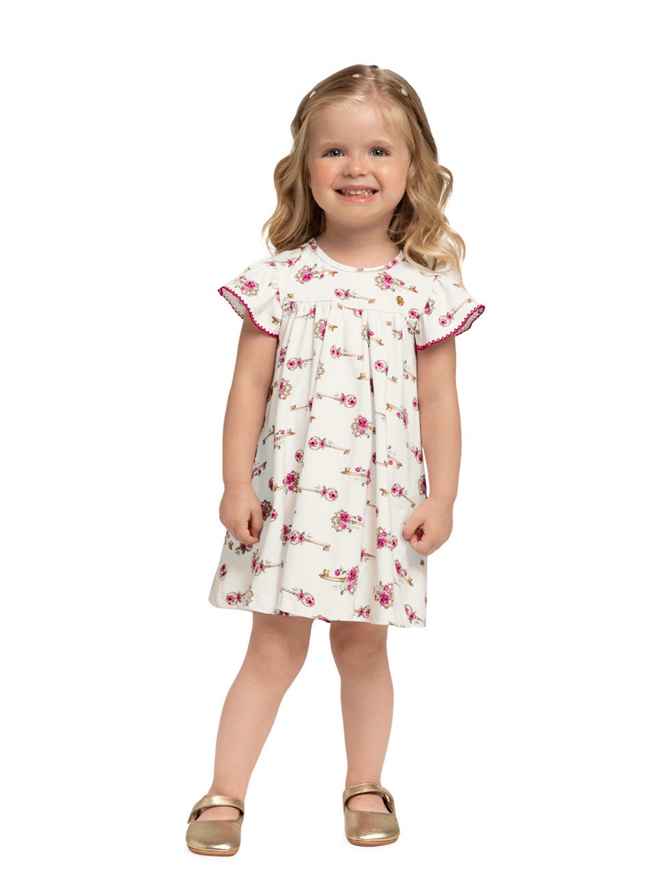 O vestido é confeccionado em cotton, oferecendo um toque macio e leve. Esse tecido é ideal para o uso diário, proporcionando conforto durante todo o dia, além de ser fácil de cuidar e resistente a desgastes. A respirabilidade do cotton mantém a criança fresca e confortável, mesmo nos dias mais quentes.