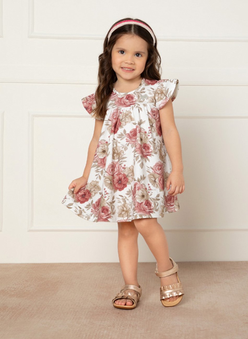 Vestido Infantil Menina Milon em cotton, composto por 95% algodão e 5% elastano, é pura delicadeza com sua estampa rotativa de flores que destaca a beleza da natureza.