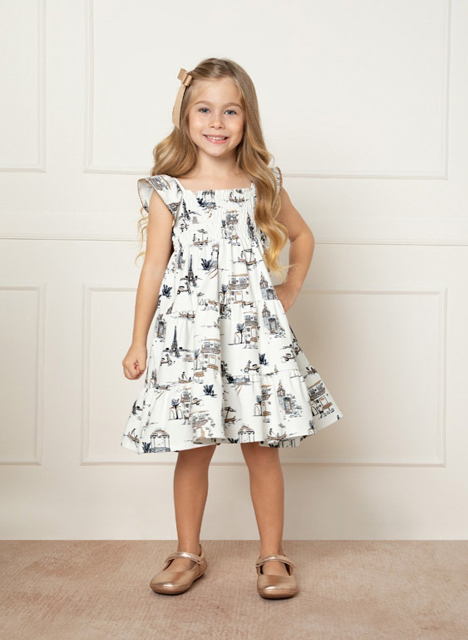 O Vestido Infantil Menina Estampa Cidade Turística Milon é a escolha perfeita para pequenas aventureiras que adoram explorar o mundo. Confeccionado em cotton, um tecido leve e macio com 95% algodão e 5% elastano, garante liberdade de movimento e um toque suave na pele.