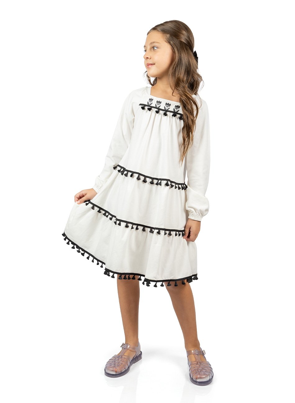 A estampa frontal é um destaque à parte, trazendo um visual único e encantador à peça. Os detalhes dos pompoms adicionam um toque divertido e lúdico, tornando o vestido ainda mais especial para sua pequena. As mangas longas são ideais para proteger sua filha em diferentes estações, proporcionando conforto e estilo em qualquer situação.