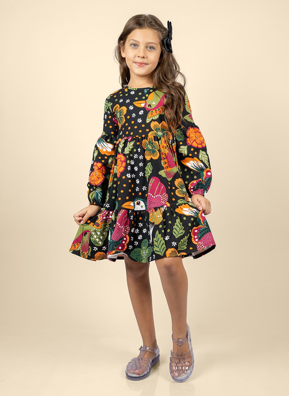 A estampa rotativa é um destaque à parte, trazendo um visual único e encantador à peça. Cada vestido possui uma estampa exclusiva, tornando-o ainda mais especial para sua pequena. As mangas longas são ideais para proteger sua filha em diferentes estações, proporcionando conforto e estilo em qualquer situação.