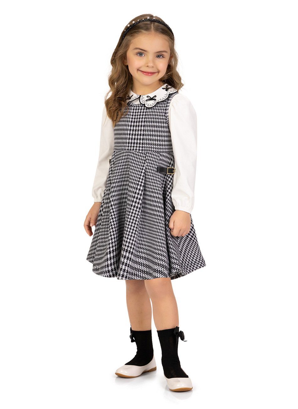 Conjunto Elegance: Vestido Jacquard Pied de Poule e Blusa com Gola Laser