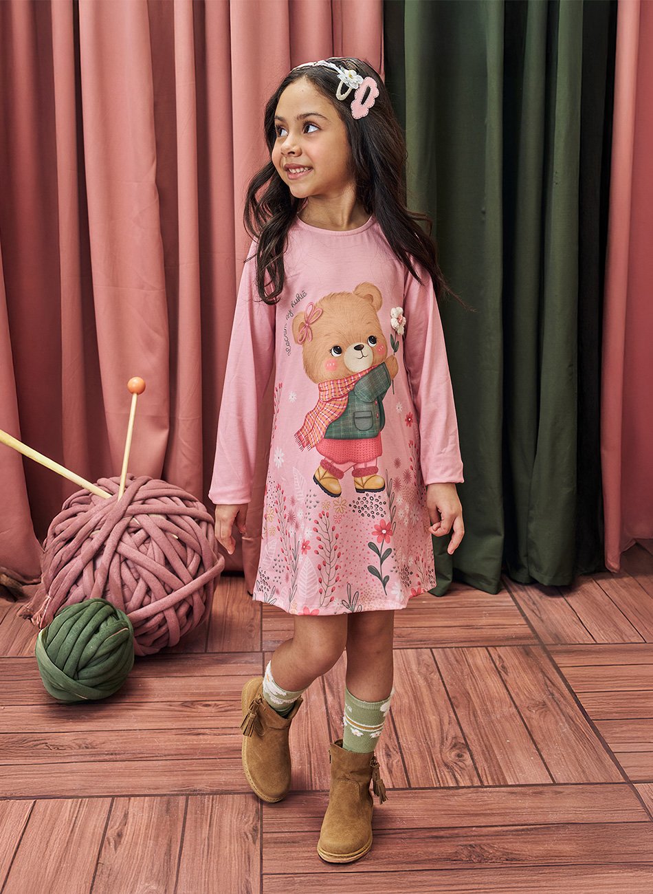 O destaque deste modelo fica por conta da estampa rotativa, que traz um visual alegre e moderno, perfeito para meninas cheias de personalidade. Cada peça é única, pois a estampa pode variar, tornando o vestido ainda mais especial. Além disso, o fechamento nas costas com botão facilita na hora de vestir, garantindo praticidade no dia a dia.