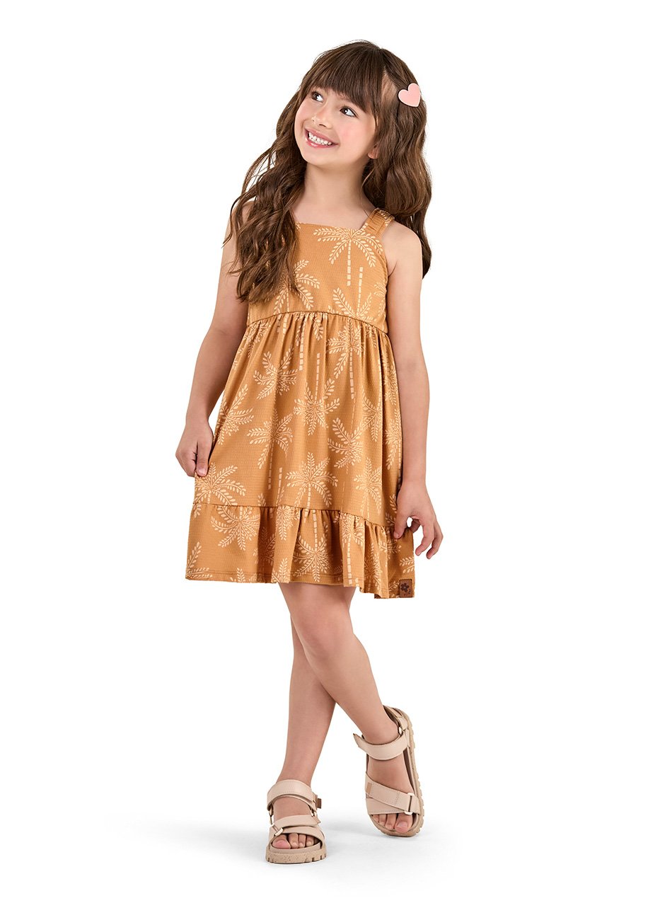 As alças em regata proporcionam um visual fresco e moderno, ideal para os dias mais quentes. Os babados na barra do vestido adicionam um toque charmoso e elegante, conferindo movimento e graciosidade ao caminhar. A malha utilizada é leve e respirável, garantindo conforto durante todo o dia, seja nas brincadeiras, na escola ou em passeios com a família.