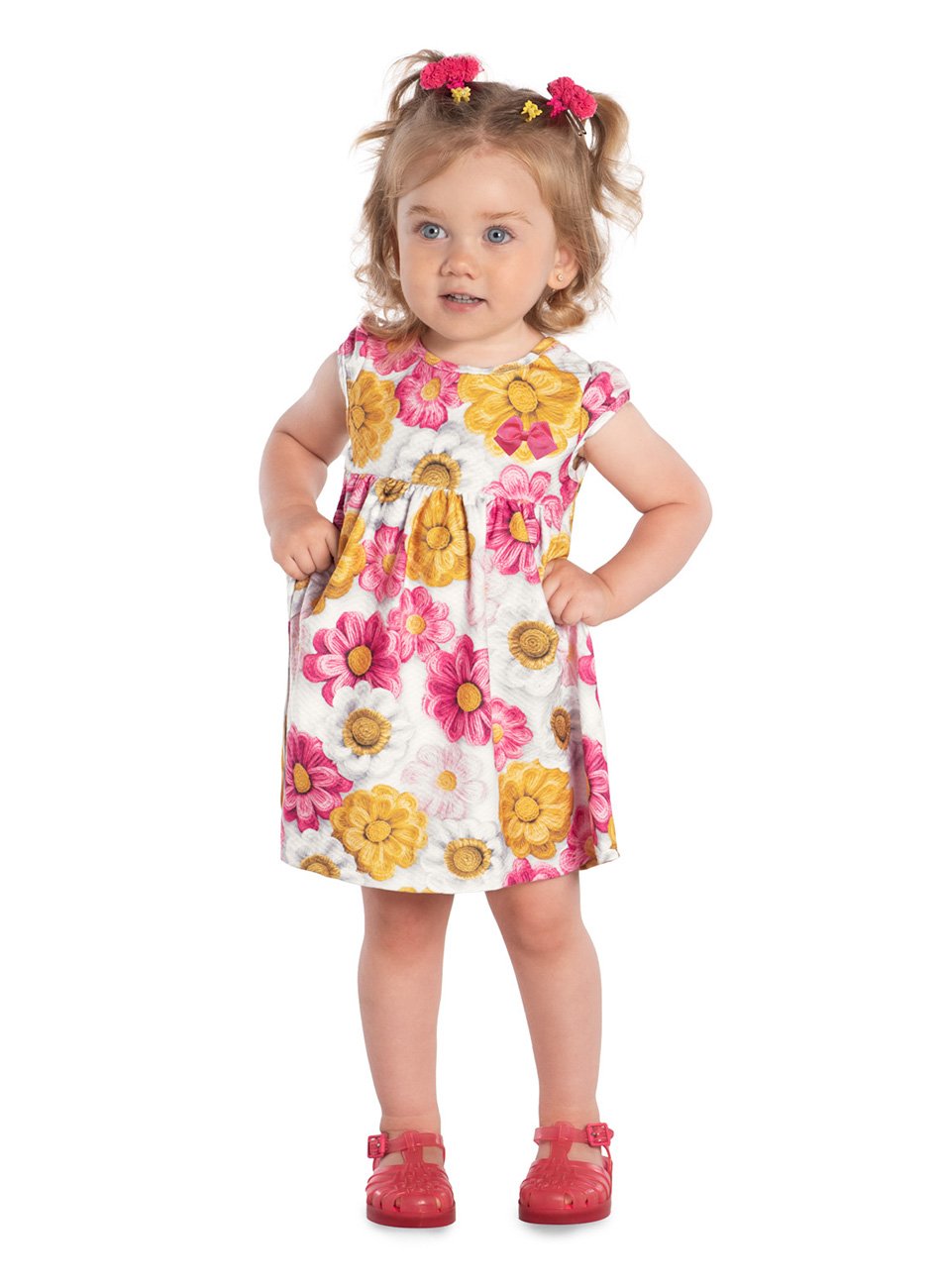 Feito em malha trabalhada, o vestido oferece um toque macio e respirável, proporcionando o máximo conforto para sua pequena. O destaque do vestido é a estampa rotativa, que traz um padrão divertido e moderno, garantindo que sua filha se sinta estilosa e animada a cada uso.