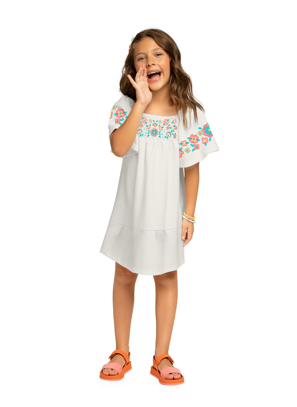 O vestido é feito com malha trabalhada que é leve e confortável, permitindo que a criança se mova com facilidade e desfrute de suas atividades diárias. A combinação de detalhes, como a estampa rotativa e as mangas flutuantes, faz com que esta peça seja perfeita para eventos especiais, passeios ou mesmo para um dia de diversão com amigos e familiares.