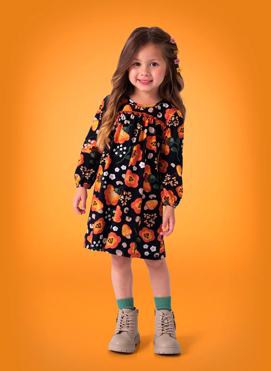 A estampa rotativa é um destaque à parte, trazendo um visual único e encantador à peça. Cada vestido possui uma estampa exclusiva, tornando-o ainda mais especial para sua pequena. As mangas longas são ideais para proteger sua filha em diferentes estações, proporcionando conforto e estilo em qualquer situação.