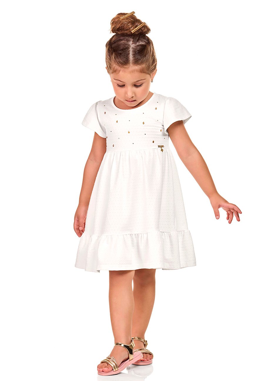 A aplicação de strass traz um toque de brilho e sofisticação, fazendo deste vestido uma opção elegante para festas ou encontros especiais. As mangas com babados adicionam um detalhe delicado e feminino, criando um visual romântico e alegre. A modelagem do vestido é ideal para garantir o conforto das meninas, permitindo que elas se divirtam com total liberdade.