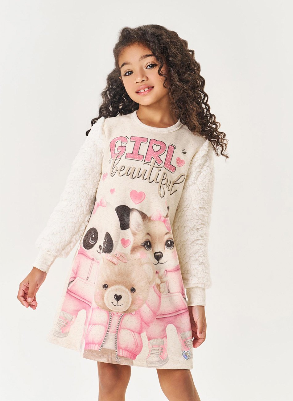 O Vestido em Molecotton Linho Felpado e Pelo Carneirinho Infantil Menina Cinti é a escolha ideal para garantir conforto e estilo em qualquer ocasião. Confeccionado com materiais de alta qualidade, este vestido oferece durabilidade, maciez e um ajuste perfeito. A estampa frontal com detalhes em strass adiciona um toque especial e encantador ao design.