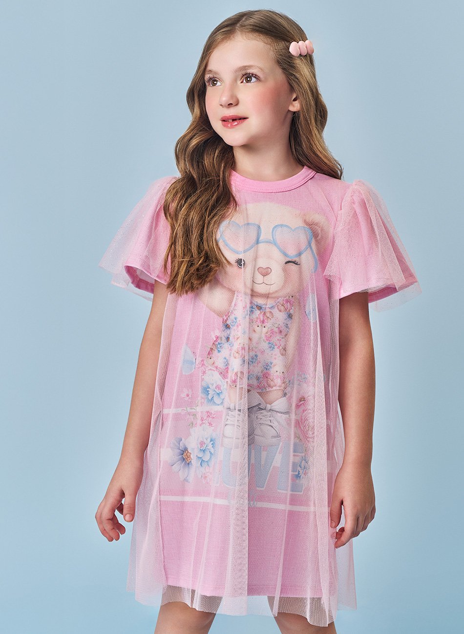 O grande destaque da peça é a estampa frontal exclusiva, que traz alegria e personalidade ao visual. Sobre ela, o tule foil adiciona um brilho sutil e sofisticado, criando um efeito cintilante que encanta sem exageros. O tule foil é leve, transparente e aplicado como sobreposição, garantindo movimento e um toque especial à peça.