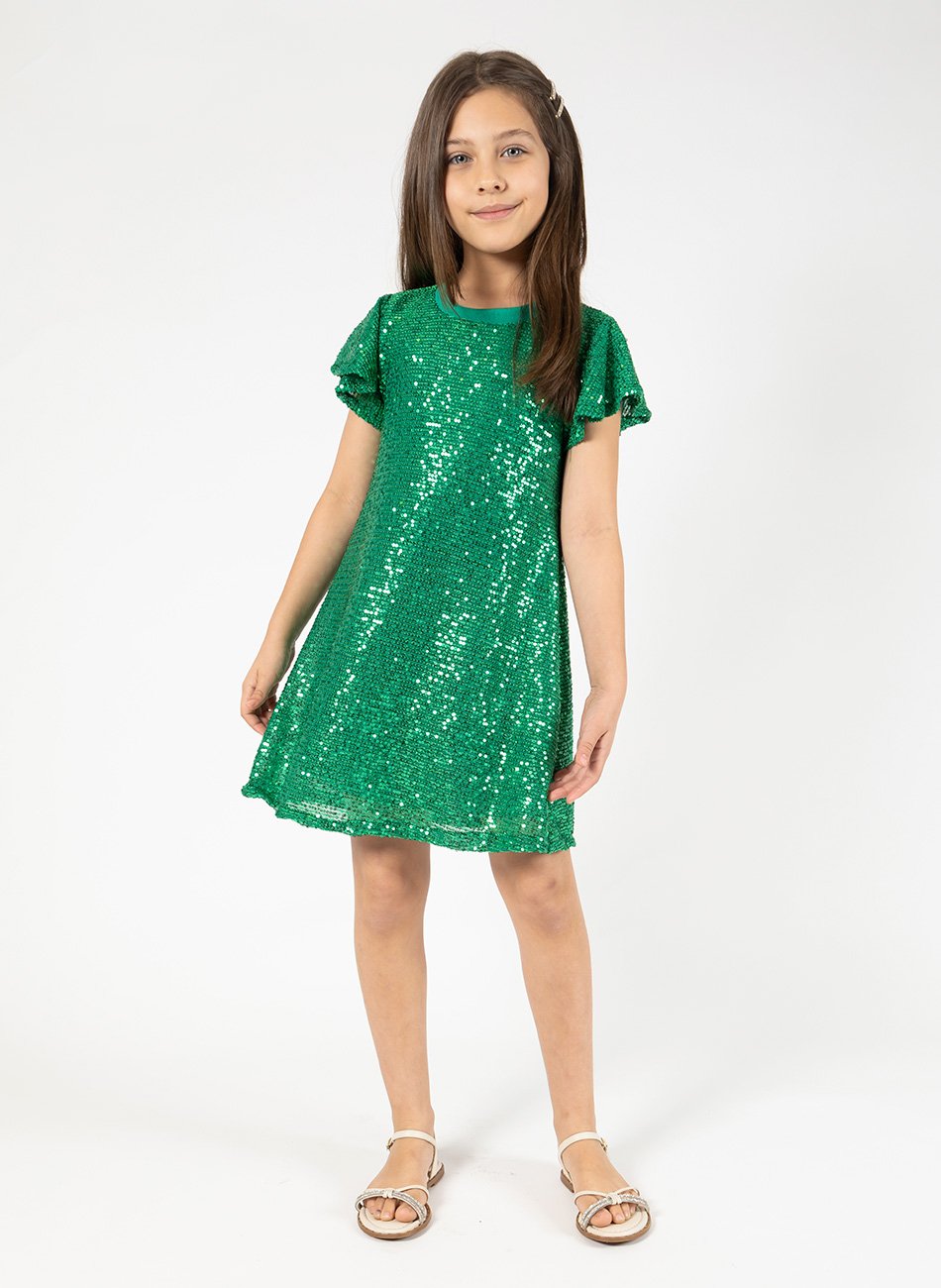 Vestido infantil em paetê com forro interno macio, garantindo conforto e segurança durante o uso. Possui modelagem soltinha em formato “A”, que proporciona leveza e liberdade de movimento. As mangas curtas com leve transparência conferem um toque delicado e sofisticado à peça.