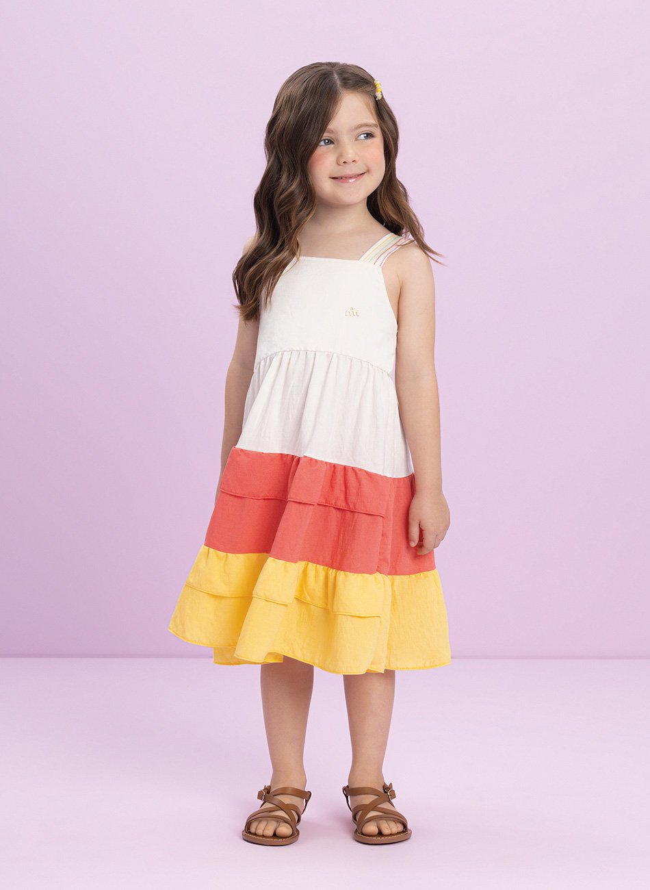 Confeccionado em tecido de poliamida rajada, o vestido garante um toque suave à pele e excelente caimento, ideal para os dias mais quentes. O grande diferencial está nas alças decoradas com linhas coloridas, que adicionam um toque criativo e vibrante à peça, despertando a atenção e valorizando a originalidade do look infantil.
