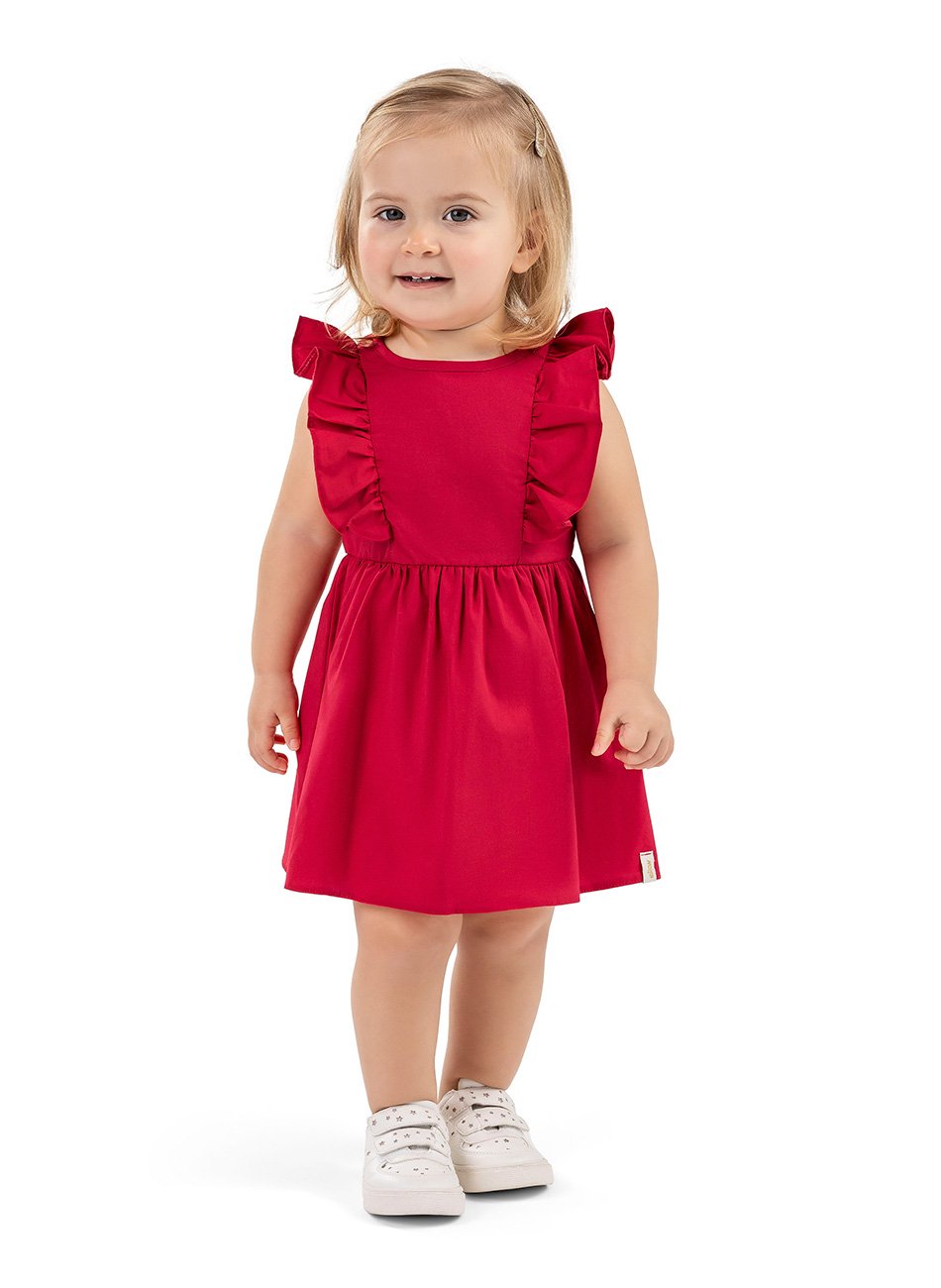 O destaque do design são as mangas com babados, que conferem um toque delicado e charmoso ao modelo, tornando-o ainda mais encantador. A textura do tricoline dá ao vestido um acabamento impecável, com uma caída suave que valoriza a silhueta da criança. O vestido é ideal para eventos especiais, como festas e celebrações, mas também é versátil o suficiente para ser usado em momentos mais casuais.