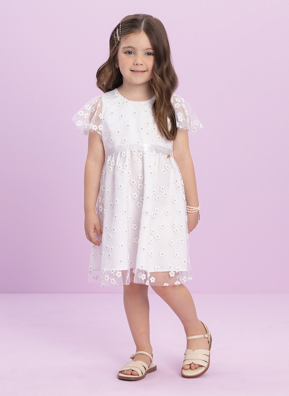 Confeccionado em camadas de tule com efeito de flores em 3D, o vestido traz movimento e volume na medida certa, sem pesar, oferecendo uma estética moderna, romântica e delicada. O toque final fica por conta da fita de cetim aplicada, que adiciona elegância e acabamento refinado à peça.