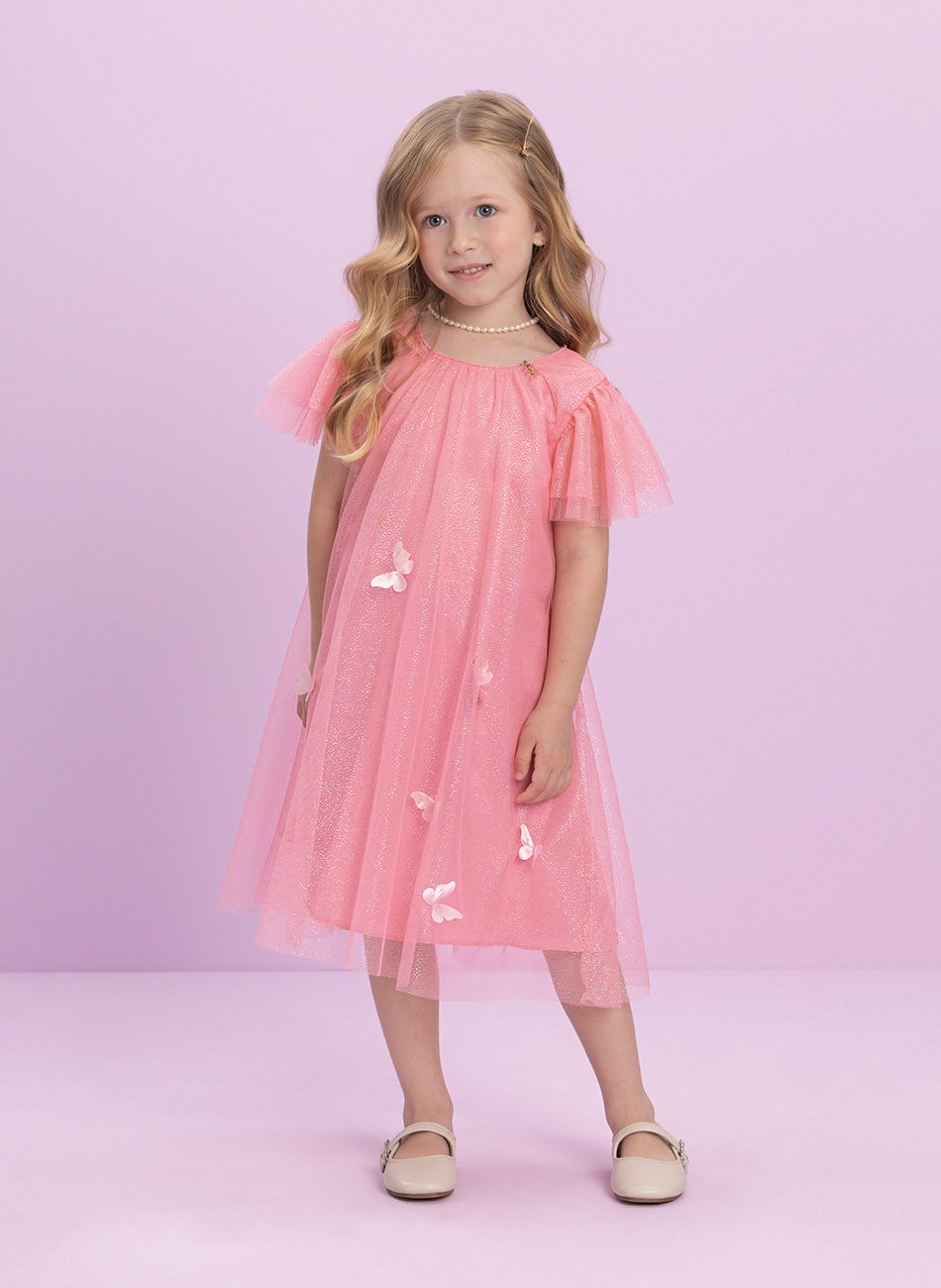 Confeccionado em tule com brilho sutil, o vestido ganha movimento e luminosidade a cada passo. A grande estrela do design é a aplicação de borboleta em 3D na parte frontal, que confere um efeito encantador e desperta a imaginação das pequenas. Um verdadeiro toque de fantasia que faz do vestido mais que uma roupa — faz dele um sonho!