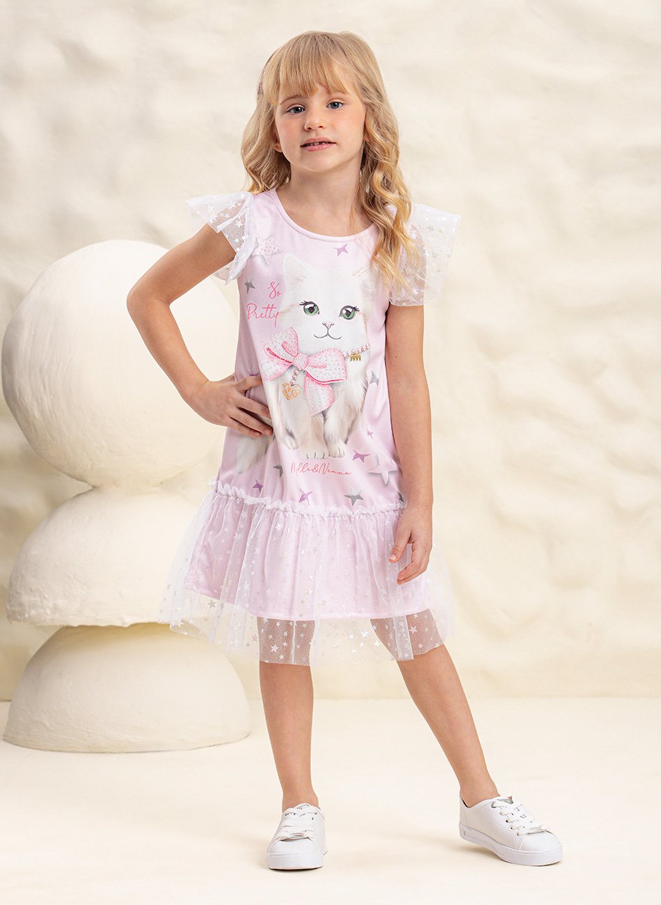 Vestido Infantil Menina da Milli & Nina combina o toque delicado do tule com a fofura de uma estampa de gatinho, criando uma peça cheia de charme e graça. As mangas em tule e a saia de tule adicionam um toque de sofisticação e leveza, enquanto o detalhe de strass proporciona um brilho discreto que realça a beleza da peça. Ideal para festas e ocasiões especiais, este vestido vai encantar as meninas que adoram um look elegante e divertido ao mesmo tempo.