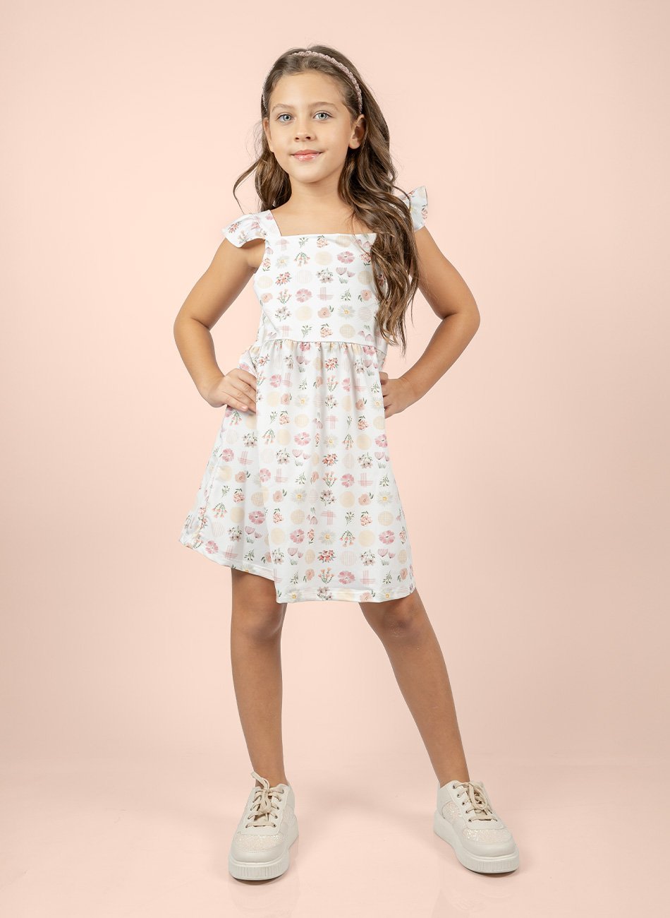 A estampa rotativa floral adiciona um charme especial e alegre ao vestido, tornando-o perfeito para diversas ocasiões, desde festas de aniversário até passeios casuais. As mangas com babado conferem um toque romântico e sofisticado, enquanto a cintura franzida realça a silhueta infantil de maneira graciosa e delicada.