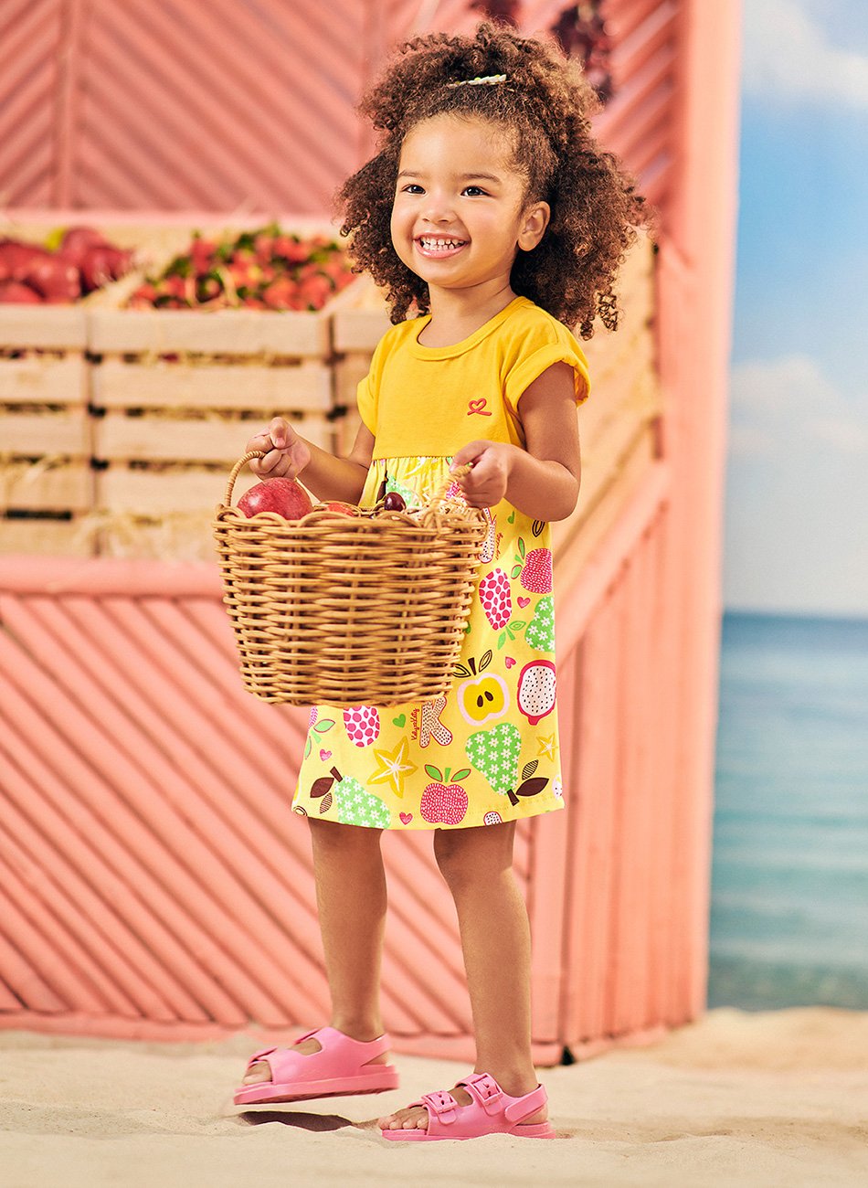 O grande destaque deste vestido é sua estampa rotativa, que traz um visual alegre e exclusivo. Com padronagens divertidas que se repetem por toda a peça, cada vestido tem um charme único, perfeito para deixar o look das meninas ainda mais especial. Esse design colorido e dinâmico é ideal para o dia a dia ou ocasiões mais informais, garantindo que as pequenas sempre estejam com um visual moderno e cheio de personalidade.
