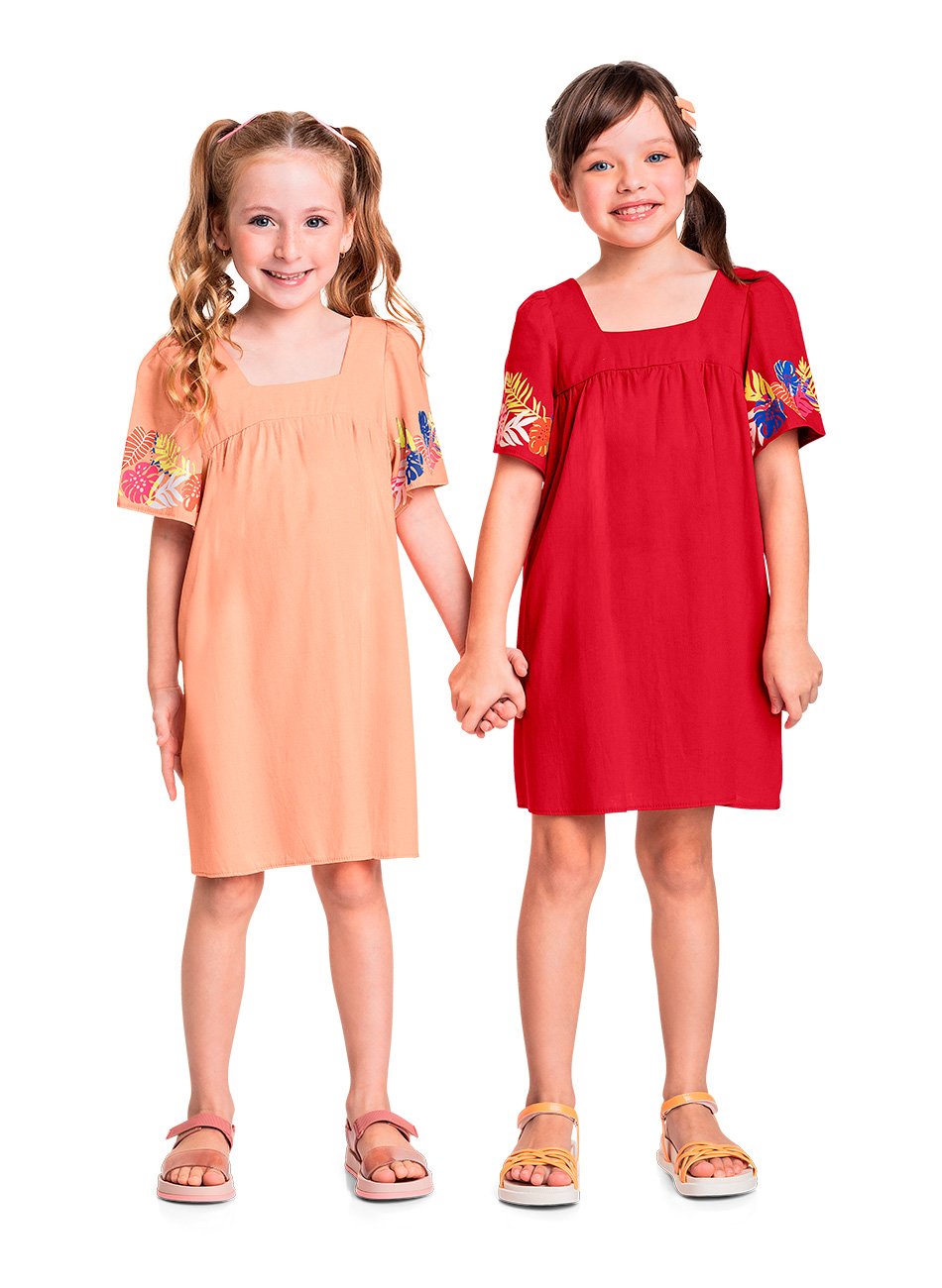 Um dos grandes destaques deste vestido é a gola reta, que adiciona um toque de elegância ao design, tornando-o perfeito para diversas ocasiões, desde passeios ao parque até festas de aniversário. A gola oferece um caimento impecável, enquanto as mangas têm um detalhe delicado que traz um charme extra à peça.