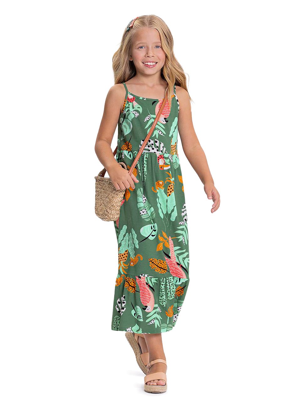 Vestido Midi Infantil Alakazoo com Alças Finas e Estampa Floresta. Este vestido combina estilo, conforto e delicadeza, sendo a escolha perfeita para dias de lazer ou passeios especiais.