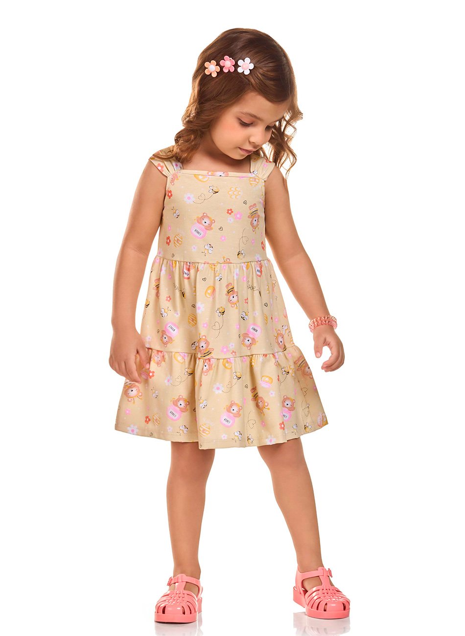 Este modelo conta com uma estampa rotativa moderna e cheia de vida, que traz cores e alegria ao look da sua filha. Cada detalhe foi cuidadosamente pensado para realçar a personalidade infantil, e a gola reta adiciona um toque clássico e sofisticado, equilibrando o visual descontraído e elegante. A gola reta confere um acabamento limpo e refinado ao design, perfeito para compor visuais para festas, eventos familiares ou para o uso cotidiano.