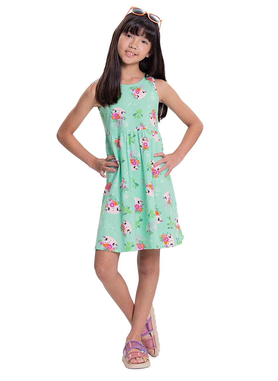 O grande destaque deste vestido é sua estampa rotativa, que cobre toda a peça com desenhos alegres e encantadores, proporcionando um visual divertido e encantador. A meia malha penteada garante não apenas conforto, mas também durabilidade, permitindo que a peça mantenha sua cor e forma após diversas lavagens. Com uma modelagem leve e fluida, o vestido permite que as meninas se movam com facilidade, seja para brincar ou passear.