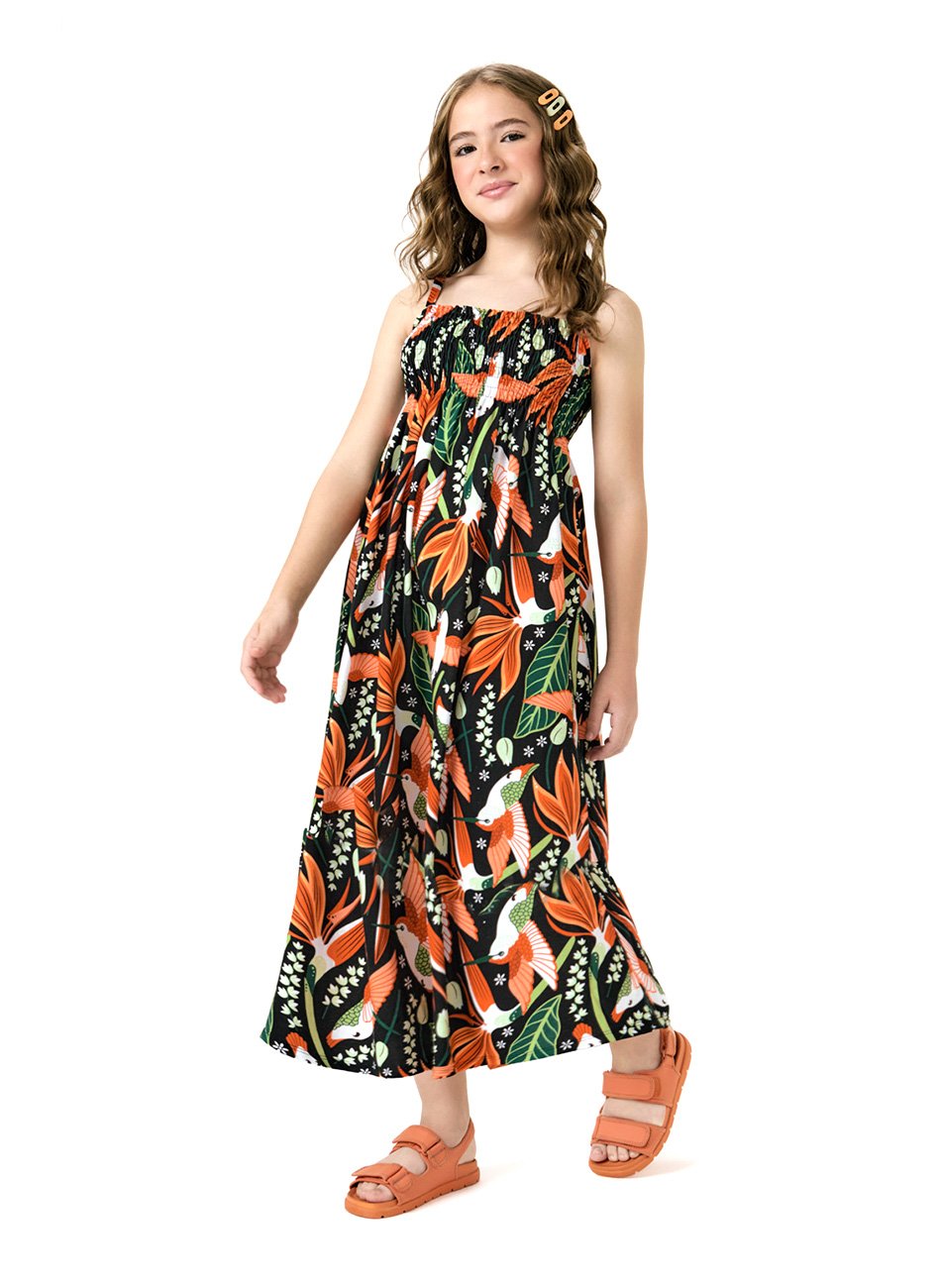 A estampa rotativa dá um toque vibrante e cheio de estilo, tornando o vestido ainda mais encantador. O design com gola reta confere um acabamento sofisticado, enquanto as alças finas proporcionam leveza e elegância ao visual. Essa combinação cria um look fresco e confortável, perfeito para os dias mais quentes.