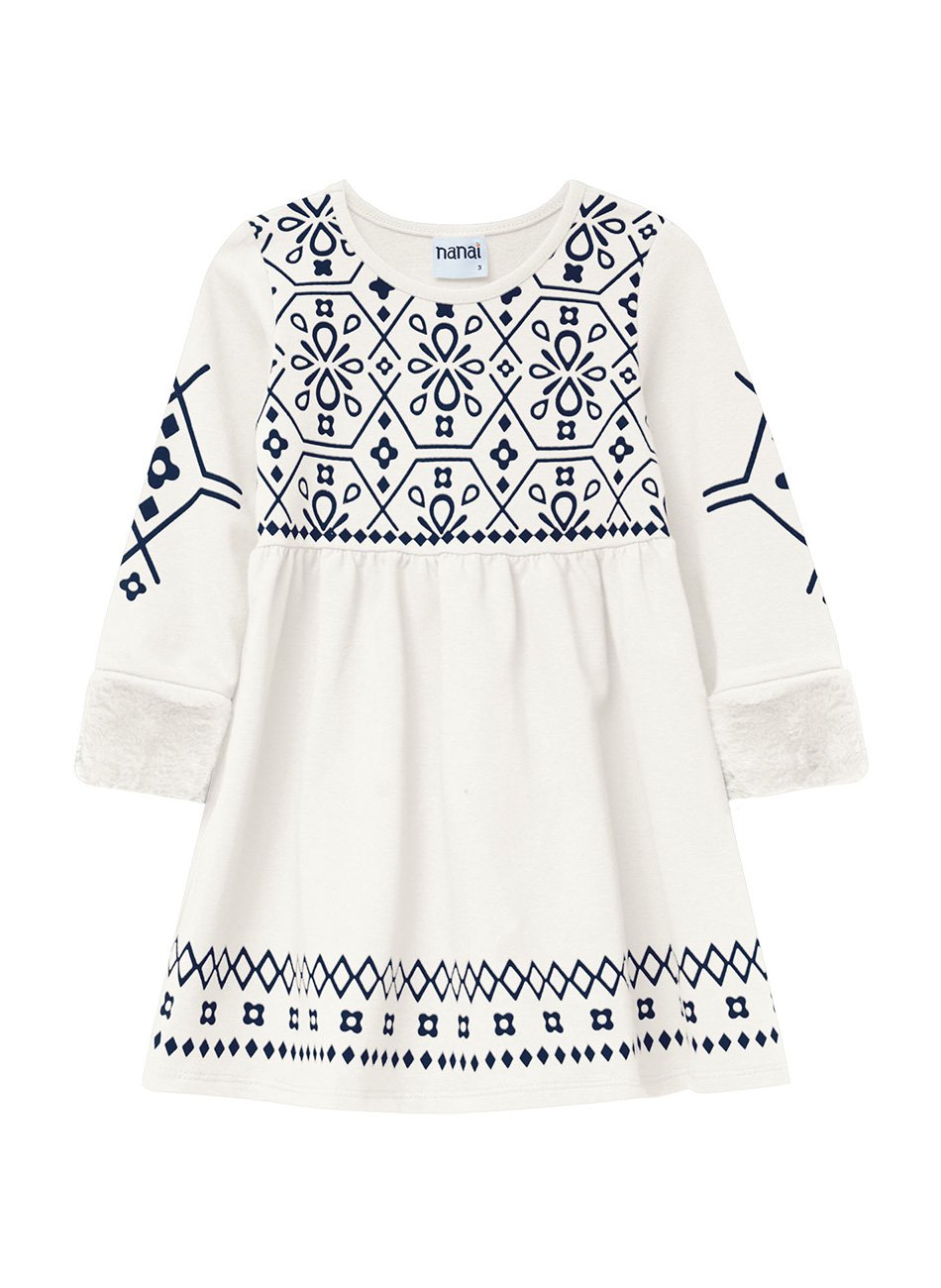 Vestido Infantil Menina Nanai, confeccionado em molecotton sarjado, composto por 96% algodão e 4% elastano, garantindo conforto e flexibilidade para as pequenas.